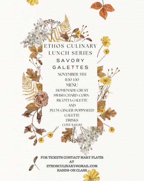 For Registration: Please email me for the class you would like to attend, and I will respond with more information for tickets. Send to Mary Platis at ethosculinary@gmail.com. Thank you.